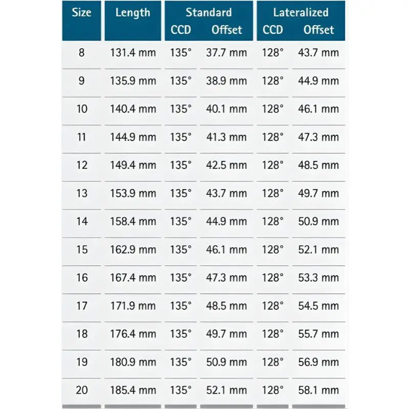- Opciones de Offset: Ambos vástagos están disponibles en versiones estándar (ángulo CCD 135°) y lateralizadas (ángulo CCD 128°), permitiendo una reconstrucción individual del offset femoral.