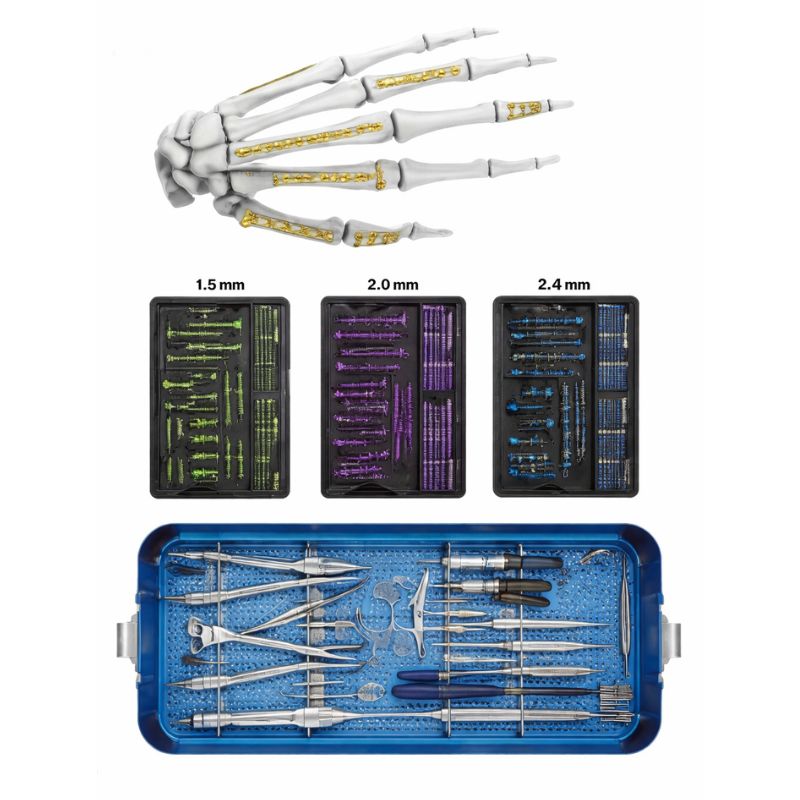 Este sistema modular de placas de bloqueo (LCP) está diseñado específicamente para la fijación interna, reconstrucción y artrodesis de huesos pequeños. Es una solución versátil y precisa para cirugías de mano, muñeca, pie y tobillo, permitiendo un abordaje anatómico con perfiles de bajo impacto para proteger los tejidos blandos.