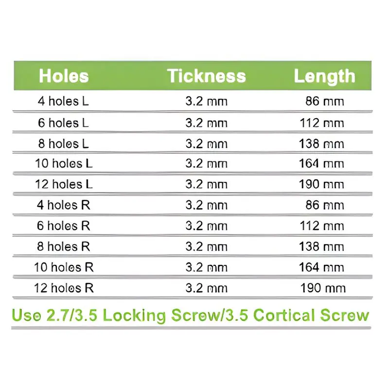 - Versatilidad de Tamaños: Disponible en configuraciones desde 4 hasta 12 orificios para diversas extensiones de fractura.
